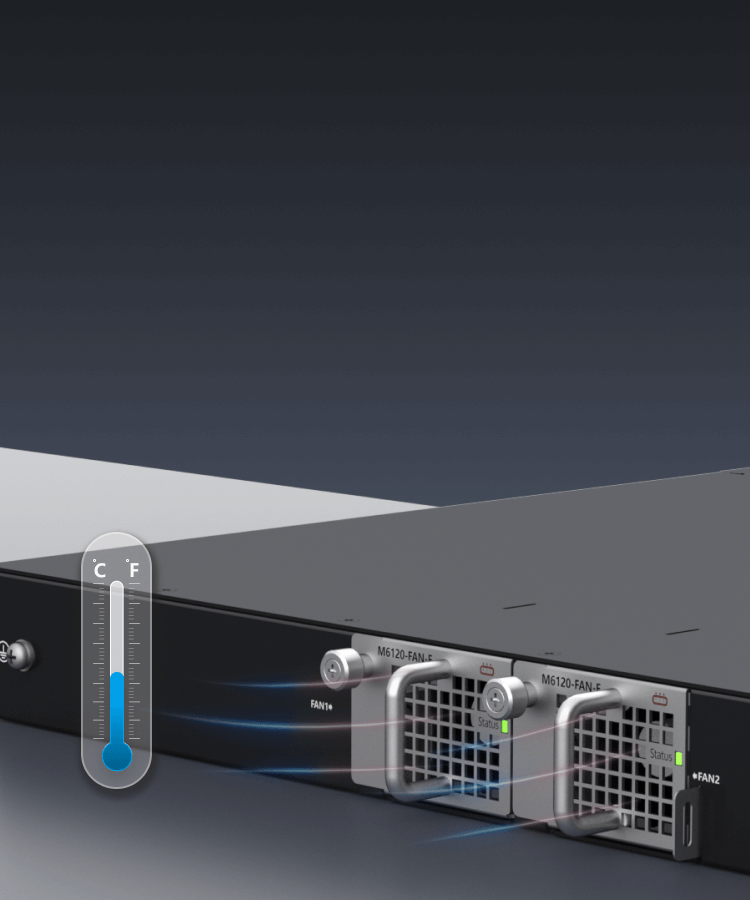 支持内置冗余电源模块和模块化风扇组件,电源模块以及风扇模块均可以热插拔而不影响设备的正常运行。此外整机还支持电源和风扇的故障检测及告警,可以根据温度的变化自动调节风扇的转速,更好的适应环境。设备支持前/后通风,提升散热效率,还具备设备级和链路级的多重可靠性保护。采用过流保护、过压保护和过热保护技术。